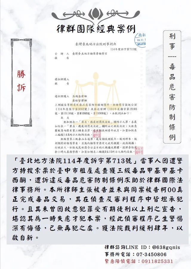 當事人因遭警方持搜索票於臺中市租屋處查獲三級毒品甲基甲基卡西酮,遭訴違反毒品危害防制條例求助於律群國際法律事務所。
