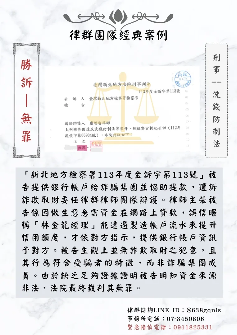 「新北地方檢察署113年度金訴字第113號」被告提供銀行帳戶給詐騙集團並協助提款,遭訴詐欺取財委任律群律師團隊辯護。律師主張被告係因做生意急需資金在網路上貸款,誤信暱稱「林金龍經理」能透過製造帳戶流水來提升信用額度,才依對方指示,提供銀行帳戶資訊予對方。被告主觀上並無詐欺取財之犯意,且其行為符合受騙者的特徵,而非詐騙集團成員。由於缺乏足夠證據證明被告明知資金來源非法,法院最終裁判其無罪。
