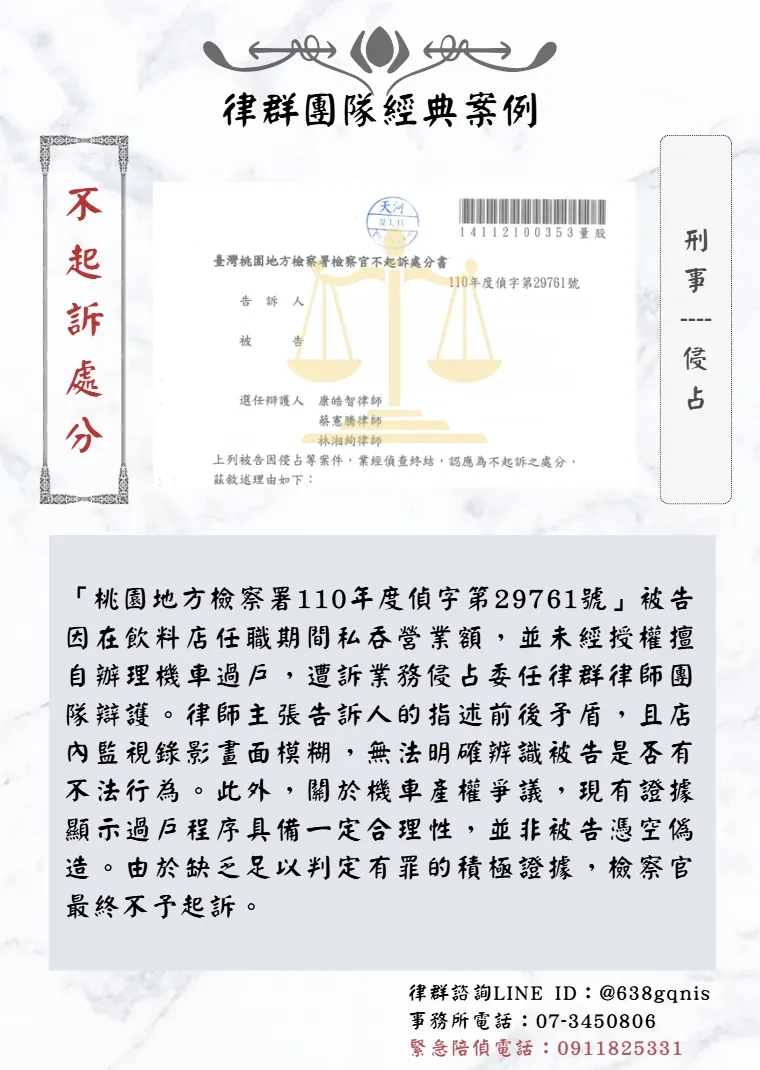 「桃園地方檢察署110年度偵字第29761號」被告因在飲料店任職期間私吞營業額,並未經授權擅自辦理機車過戶,遭訴業務侵占委任律群律師團隊辯護。律師主張告訴人的指述前後矛盾,且店內監視錄影畫面模糊,無法明確辨識被告是否有不法行為。此外,關於機車產權爭議,現有證據顯示過戶程序具備一定合理性,並非被告憑空偽造。由於缺乏足以判定有罪的積極證據,檢察官最終不予起訴。